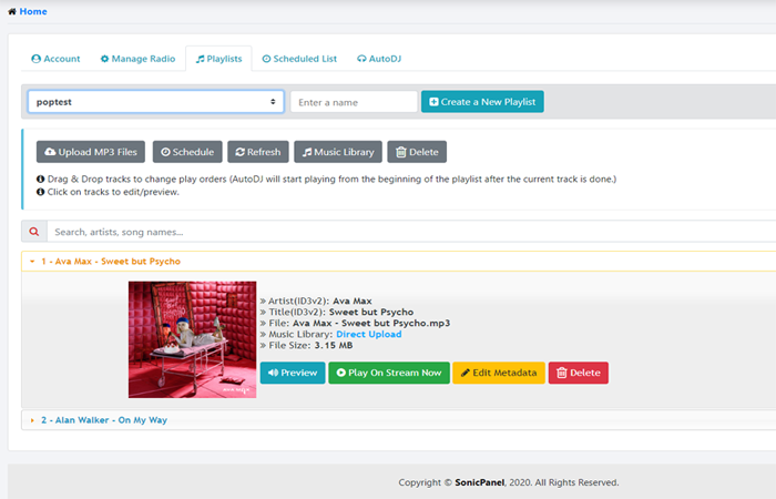 SonicPanel müşterilerinize gelişmiş bir çalma listesi yöneticisi sunar. Kullanıcı müzik dosyalarını çoklu veya tekil sürükle bırak yaparak veya seçerek bilgisayarından yükleyebilir ve kolayca çalma listesine ekleyebilir. FTP yerine bu sistem kullanılmaktadır, chunk upload sistemi olduğundan FTP'den 100x daha hızlı yükleme yapar. (Daha Fazla Bilgi). Kullanıcılar müzik dosyalarını çalma listesi yöneticisinde düzenleyebilir, sıraya dizebilir, id3v2 taglarını düzeltebilirler. Albüm resimlerini görebilir ve istediği müzik dosyasını dilerse anında radyosunda canlı olarak çalabilirler, sistem dinleyicileri rahatsız etmeden fade efekti ile giriş yapar.